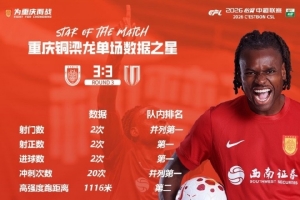 体育资讯3月26日讯 中超第3轮,重庆铜梁龙3-3战平成都蓉城,据铜梁龙官方统计,迪马塔和吴宇曦成为本轮队内关键球员。